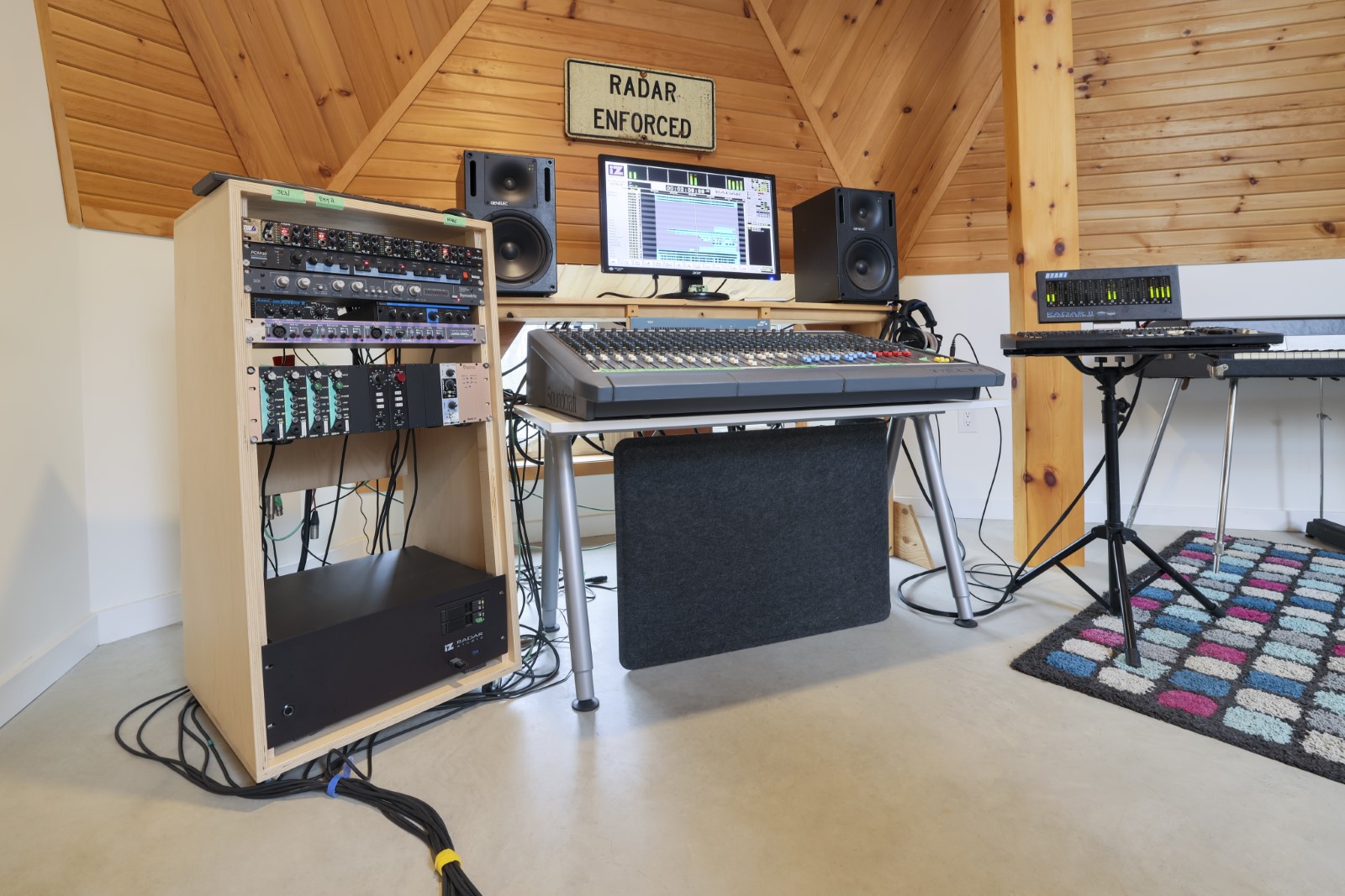 Acoustics are pleasing and conducive to recording "live off the floor". The recording system is on the tracking floor for effortless flow and communication.
