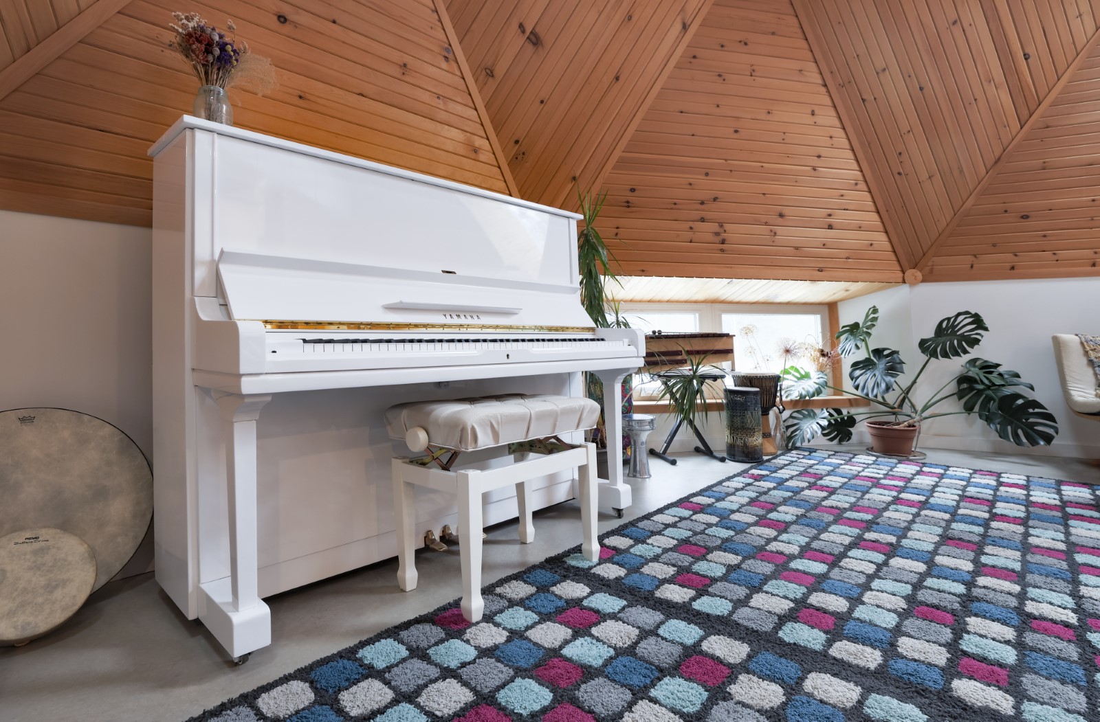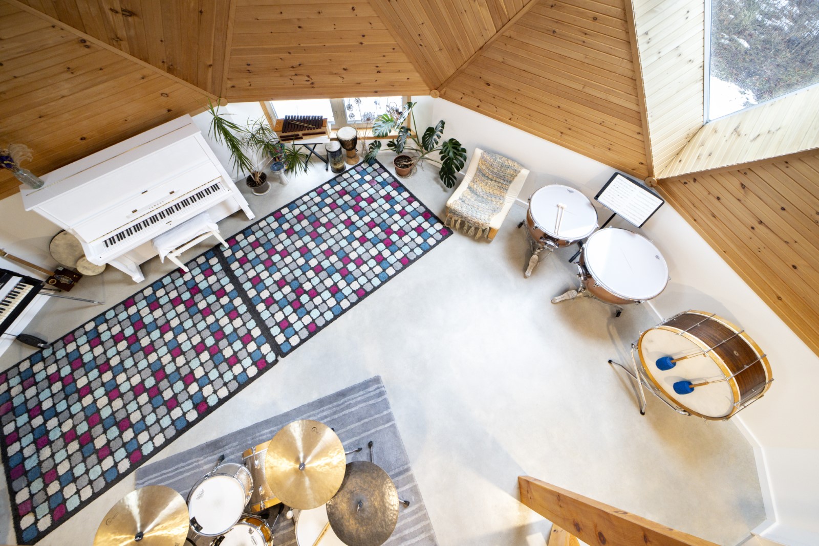 The StarBird complex comprises two geodesic domes joined via a connecting foyer, creating an organic work-live environment. The studio portion is a 625sq ft geodesic dome attached to our main living dome. This Scandinavian-inspired space is where we create, teach and record music. The large triangular skylights and walls of whitewash and pine add to the tranquillity.